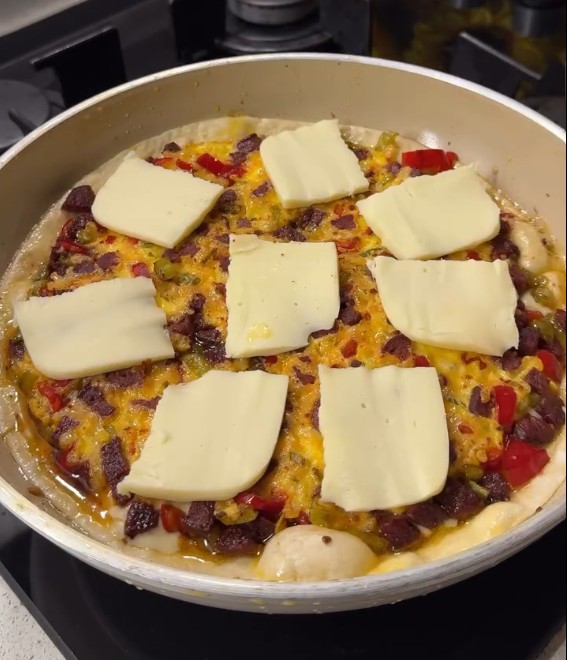 Yumurtalar hafif pişmeye başlayınca kaşar peynirlerini yerleştirin. Üzerine lavaşı kapatın ve lavaşın üzerine az miktar sıvı yağ sürün. Bu, pizzanın her iki tarafının güzelce kızarmasını sağlar. 1-2 dakika sonra bir kapak yardımıyla pizzayı çevirin.